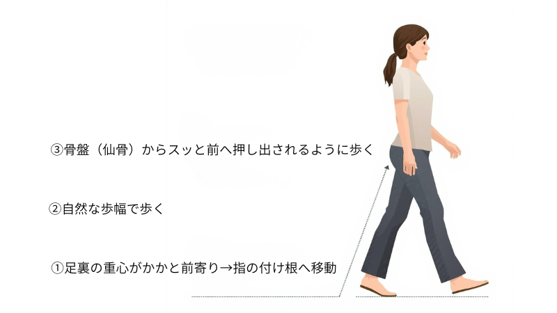 ① かかとの“後ろ”ではなく、かかとの“前寄り”から着地 → MP関節(指の付け根)へ重心移動
